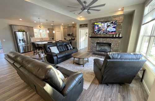 This open concept split ranch home features a large kitchen with a large island. The adjoining living room area has a recessed ceiling and fully bricked gas fireplace, which is adorned with a 65" TV. The four-seasons room features a ton of windows giving you a perfect view of nature along with a coffee bar to enhance your leisurely mornings. The roomy kitchen is well stocked, comes with full-size appliances and opens up to the dining and living rooms. The adjacent dining area has a table with seating for 8, along with additional seating for 8 at the kitchen island.