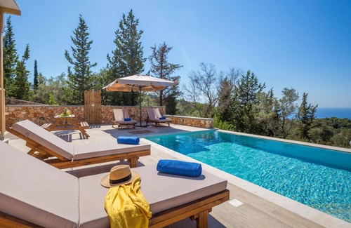 Not only is this a wonderful position within 550m walking distance of shops and tavernas but there are also gorgeous, sweeping sea views to savour from the rooms, terraces and private, infinity-edged pool. Just a short drive brings you to the lovely coastline itself and the popular beaches of Gialo Skala (2.8km) and Pefkouli (3.7km).