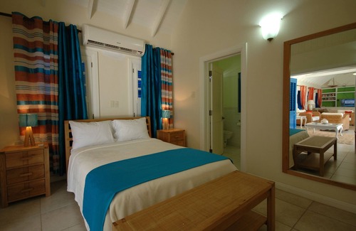 This villa is very well built and decorated, with the care and attention to detail of a personal home. The fully outfitted kitchen opens onto the pool deck and looks through into the living room. It boasts stainless steel appliances and a full range of cookware. The large living area has demerara windows all along one side, and doors leading out to the pool deck along the other, keeping this house always cool and breezy.