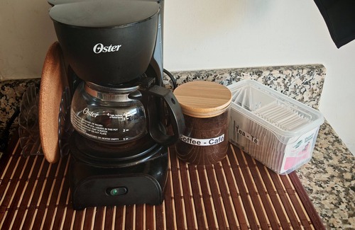 Coffee maker (with coffee & tea), salt, sugar, utensils, and a large fridge with freezer