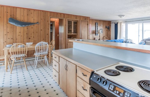 Crown your vacation with a stay in Waldport at Corona, a single-level two-bedroom home with classic, retro appeal. Lined in paneling with a wood fireplace, this sweet home has some unexpected perks, including a fenced yard, fire-pit, and even a hot tub in the back. Cross the street to a steep but navigable path down to the beach, where you can watch harbor seals sunning themselves on the spit and gaze at the Alsea Bay bridge spanning the two ridges that embrace Waldport. You can walk to a nearby coffee shop; a market for groceries and a liquor store are just a mile away. Two cozy sofas by the wood-burning fireplace and large TV will draw your guests together in the living room, and floor-to-ceiling sliders and windows bring in plenty of light. A fully equipped kitchen with an island breakfast bar adjoins a dining table if you want to cook, though you’re a quick walk to delicious sandwich fare and beer at the Hilltop Bistro. Two pretty paneled bedrooms, one with sliders to the outdoors, give you comfortable places to retreat.