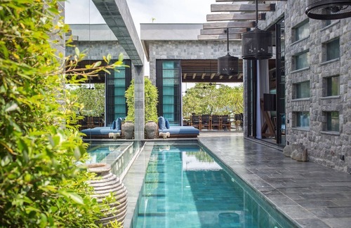 Three aesthetically designed master bedrooms are housed in the courtyard surrounding the second infinity pool backed by a vast mirror and fringed with tropical greenery.