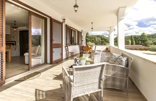 The outdoor spaces of Villa Flaminia are a true paradise for those who love living outdoors. The large panoramic terrace, furnished with comfortable sofas and a shaded dining area, is the ideal place to enjoy dinners under the stars or moments of relaxation at sunset, overlooking the surrounding nature. The garden, cared for in every detail, is inspired by the local flora, integrating typical plants of the Mediterranean scrub in a harmonious and regenerating environment.