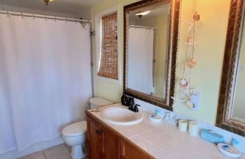 After a long day exploring the island, come home and unwind under the outdoor shower inside a natural cliff. The shared full bathroom also includes a unique sunk in bathtub to unwind and relax in.
