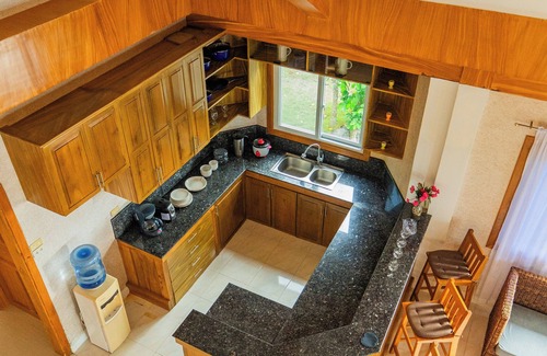 East House is a 3-bedroom sanctuary nestled on a serene cliffside, featuring a master bedroom with a king bed, private bathroom, and breathtaking ocean views. The second bedroom is furnished with two single beds, while the third has one single bed—both sharing a separate common bathroom. All bedrooms are equipped with full-size cabinets for ample storage.