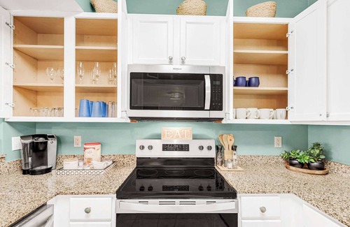Inside, you’ll have a stackable washer/dryer for seamless long stays. When you're ready to explore the resort, dive into a tropical paradise with Destin’s largest zero-entry lagoon pool, waterfalls, a heated pool, kiddie splash pad, and hot tub. For your well-being and recreation, take advantage of the fitness center, tennis, pickleball, and basketball courts, or let kids play on the playground while you fire up the nearby community grills.