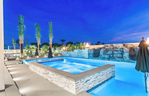 Experience ultimate relaxation and fun at this spacious Brand New Build Resort-Style Home! Enjoy a double waterslide pool, Large Spa, Sauna, Cold Plunge, Pickleball Court, Volleyball court, Mini Golf, Large Firepit, BBQ area, multiple conversation areas and a fully equipped game room with arcade games, air hockey, and more. Relax in the sauna, watch movies in the theater room, or gather around the firepit with seating for the whole party. With 8 bedrooms, outdoor misters, and a BBQ dining area, this property is perfect for groups seeking luxury and entertainment.