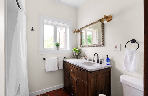 There is one full bathroom located just across the hallway and easily accessible for the guests staying in the sunroom and downstairs bedroom. The one-of-a-kind yellow full bathroom on the upper level boasts a combination shower and clawfoot tub. Worry about nothing with these thoughtfully stocked bathrooms that provide everything you need and more.