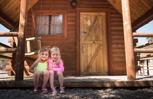 1 bedroom rustic camping cabin with electricity, A/C, heater, and small outside bbq grill. Bathrooms and showers are available in the adjacent Clubhouse. They have one double bed and one bunk bed to sleep a total of four. Linens are not provided, so bring your own bedding. You may check out bedding during office hours for a $40 fee. Cabins are about 100 yards from the Colorado river. The RV resort has swimming pool and hot tub, large beach and grass areas.