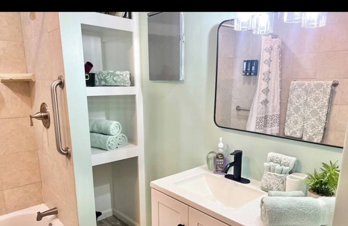 Stay comfortably in McAllen at this 2-bedroom house. With 2 queen beds and 2 futon sofa beds in living room. Guests will find the sleeping arrangements terrific.m There is a kitchen bar with 4 stools, new mocrowave, custom cabinets, granite counters. The new bathroom features a bathtub, hair drye, shampoo, conditioner, and body soap wall dispenser. Experience the magic of McAllen at our welcoming house.