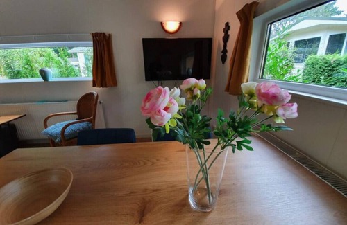 The chalet is situated in the peaceful `De Veldkamp` park, surrounded by cozy cottages and gardens. For younger guests, there is a fenced playground with new play equipment and a trampoline, while parents can relax on the terrace of the adjacent Boshuis. The park also offers bicycle rental for exploring the beautiful Veluwe forests, including the option to reserve electric bikes for extra comfort.
