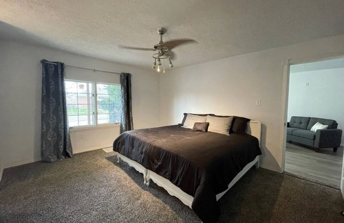 Newly renovated 2-bedroom home. Quiet and comfortable. Can accommodate up to 5 guests, with a king-size bed in the main bedroom, a twin top bunk, and a queen bottom bunk, in the second bedroom. Dine-in kitchen, plus separate dining area, off of the living room. Washer and dryer included. Perfect central location; easy drive downtown or to either sides of town.