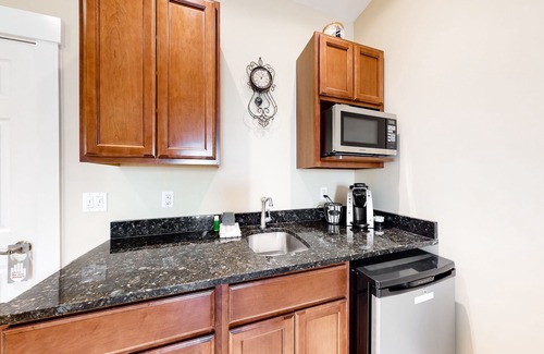 The main room brings together a sitting area with a sofa, a flatscreen TV, and a DVD player; a small dining space; and a kitchenette with a minifridge, a microwave, and a coffee maker to use when you're not downstairs grabbing something to eat at Colonel's Restaurant and Bakery. There are air conditioners in the living room and bedroom for your comfort, a second flatscreen TV in the bedroom, and free WiFi throughout the suite.