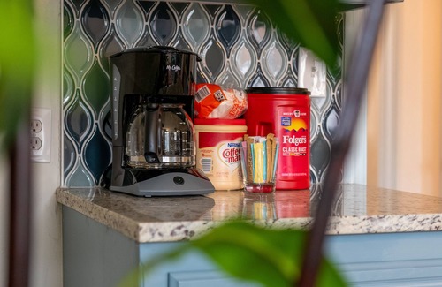 The kitchen is equipped with a refrigerator, stove, microwave, toaster, and dishwasher. There are pots and pans, plates and glasses, basic cooking utensils, coffee, creamers, and sugar.