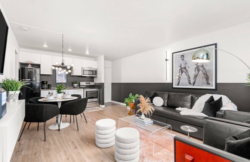Park your car in the free apartment lot and walk just a few steps to the front door on the first level of the apartment building. Upon arrival, you'll see a cozy conversation set for morning coffee and a blue front door with a keypad. Your Nashville apartment has a loungey-vibe living room with a sofa bed, dining area, stocked kitchen, two comfortable private bedrooms with queen beds, and a full bathroom with hotel-grade linens and shampoos.