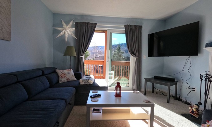 View of MT snow from every window, 15 minute walk or a free shuttle ride, or a 2 minute drive, 2 bedrooms 2 bathrooms, full kitchen, 58” TV, fireplace, 1st floor (no stairs to get in and out) freshly painted and updated, balcony