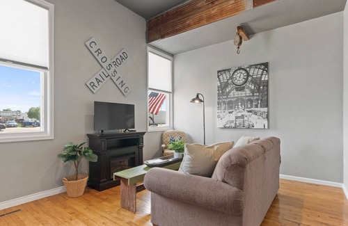 The Conductor's Suite is nestled inside The Whistle, a historic boutique railroad depot. Located next to active freight tracks, guests can peek out at the passing trains from the comfort of their room. The grounds contain private, sprawling gardens for guests to enjoy a peaceful outdoor setting. This charming suite is within walking distance from Washington's vibrant town square, Central Park, local grocery, coffee shop, restaurants and stores. The 12.5 mile Kewash trail is just down the street. The Conductor's Suite was designed with a mix of historic, turn-of-the-century character and modern updates. Known for its original hardwood floors and window view of the railroad tracks, this space offers versatile options for guests. For those who want to enjoy the trains, use the screen door to be alerted when the train whistle is nearing. Guests can watch passing trains from the rocking chairs on their front stoop. For those who seek privacy, draw the shades and experience a more intimate setting. High ceilings give this suite an open, airy feel, while the eclectic decor will charm you and your group. Don't miss the gardens! The Whistle's backyard is filled with flowerbeds, a pergola, and stationary train caboose. This location truly one-of-a-kind. The depot's neighborhood is one of the best-located in Washington. Downtown is two blocks south, with numerous restaurants, coffee shops, and even nightlife available to guests. The Kewash Trail, over thirteen miles long, is two blocks west and is a perfect way to unwind after a long day. Take your bike or head there for a walk or run. If you're feeling adventurous, stroll under the adjacent railroad tunnel to listen for an incoming rail to blow its horn in the tunnel's echo chamber.