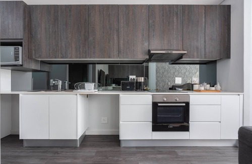 A contemporary 12th floor unit in The Sentinel - a brand new City Center development. Located a short walk from many of Cape Town's top attractions including conferencing at CTICC, the lush Company's Gardens, historic Bo Kaap, the V&A Waterfront and a wide selection of bars, eateries and nightlife on Bree, Loop and Long Streets. You really are in the center of it all! The open-plan kitchen and living area offers comfortable seating for those looking to relax after a long day exploring the city.