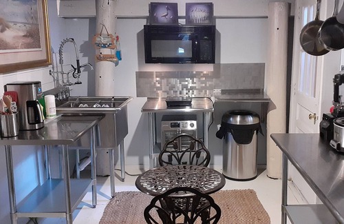 Kitchen has a large, stainless French door fridge with filtered water and an ice maker, induction stovetop, air fryer/oven, microwave, Asian style rice cooker, a slow-cooker, toaster, Coffee maker, high speed blender, electric can opener, clean stainless steel tables for prep work and a large commercial stainless wash tub with a two person bistro table and chairs set . Each guest gets one table setting with utensils, bowl, plate, drinking glass, and coffee cup. Adult guest get red and white wine glasses. No additional glassware or utensils will be provided. We suggest picking up paper plates and plastic utensils , cups, etc. if this is an issue for you.