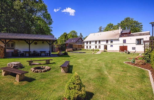 Vila Kryštof is a cosy vacation rental located in a detached apartment block built in 2015. It offers a yard, Internet WiFi, parking, and an installment plan for your convenience. Situated on the outskirts in a quiet and sunny position, this holiday rental provides shared access to a terrace, garden furniture, fireplace, barbecue house, and a children's playground.
