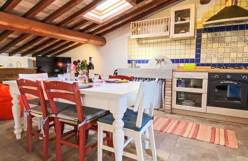 This charming "Casetta de Sodoni" is a two-level, 90-square-meter apartment featuring rustic and tasteful furnishings throughout. On the upper floor, accessible by an open staircase, you will find a living/sleeping room with a sofabed and wood-burning stove, along with two double bedrooms and a shower/WC. The second upper floor houses a fully equipped kitchen with natural stone floors and a balcony exit. The kitchen includes a dining table for your convenience.