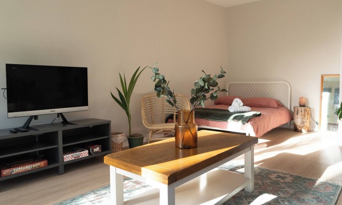 Large cosy studio cabin with en-suite and double bed situated in the grounds of a private home in the leafy suburbs of East Belfast.