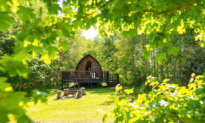 Outside, enjoy a wood fired Hot Tub, private deck, picnic bench, and a BBQ firepit with an adjustable grill, surrounded by four wooden mushrooms to sit on.