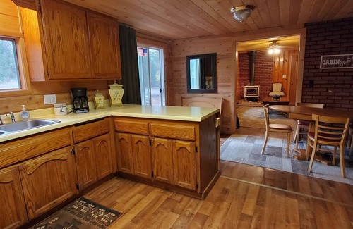 The large living room has a wood fire stove (please be advised to keep children and pets away from the wood stove, outside fire pit and bbq as they present a risk of possible burns if touched while hot), TV (no cable) & a DVD player with about 20 random movies. Full size kitchen equipped with dishware, silverware, cups, pots, pans, blender, toaster, coffee maker, tea pot.