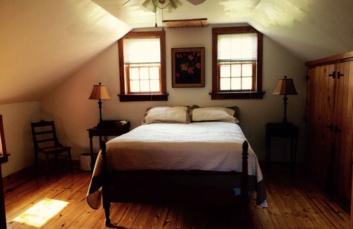 This charming two story cottage, located in a hilly neighborhood, is set on rolling land overlooking dry stacked stone walls and forest. The first floor is an open floor plan with a stone fireplace at one end opposite the kitchen. A single bedroom upstairs hosts an over-sized full mattress. There is a twin bed on the walk through area upstairs. A full bath is downstairs. The kitchen is fully equipped with a fridge, stove, dishwasher, microwave, toaster oven, coffee maker, crockpot, and an assortment of pots and pans. *Note: this structure is in a semi-rural area. Insects may make their way in despite our best efforts. If you have allergies or are sensitive in other ways, consider looking elsewhere. Your comfort is important to us.
