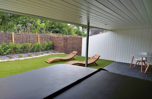 This eco-friendly cottage, perfect for a romantic getaway, offers a private outdoor hot tub as one of its standout features. Nestled on the edge of Dartmoor National Park, the property boasts a tranquil garden space with a 5-seater hot tub, ideal for unwinding after a day of exploration. The hot tub is designed to use hot water efficiently, reducing energy consumption while ensuring it's ready for use within an hour, allowing you to enjoy a relaxing soak while taking in the surrounding views. The open-plan living area features a comfortable sofa and a smart TV, providing a cozy space to relax inside. The bedroom, with a super king-size bed and ample storage, offers the perfect retreat after a day spent in the hot tub or exploring the beautiful countryside. A shared laundry room with a washer and dryer adds convenience to your stay, making it easy to keep your things fresh and clean. Guests can enjoy additional amenities, including an all-year hard tennis court and 24 acres of peaceful countryside, complete with fishing lakes. The property offers on-site parking for two cars and provides Wi-Fi to stay connected. Though the cottage does not allow pets, it’s an ideal destination for couples looking to escape to nature, relax, and enjoy each other's company.