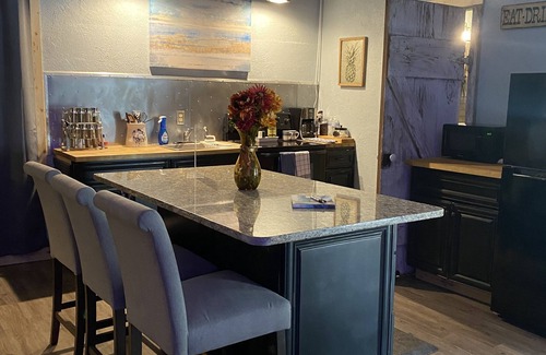 Private guest house on 2 acre property, overlooking pool and pond in lovely tranquil setting. Relax, play your music or read a book. Close to local beaches, shopping, hospitals and restaurants- including the Murrells Inlet Marshwalk. Everything you need for a weekend or a week. Large efficiency apartment includes bath and living room sitting area. Kitchen with large center island. Wifi and TV. Plenty of parking.
