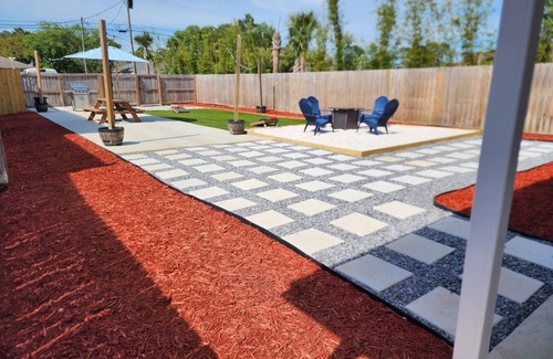 Space for up to 6 people. The outdoor yard area is completely private and has everything you could need while on vacation. There is a propane BBQ grill, picnic table, firepit area, and cornhole (in the storage container next to the fence), in the storage container, you will also find beach related items for you to enjoy during your stay.