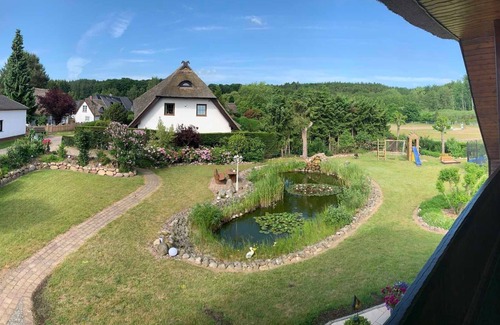 Our 40m ² dreamily beautiful, spacious apartment, located in the upper floor of a thatched family home and only 3.5 km from the Baltic Sea Binz away. Thus, you can enjoy all the amenities of a seaside resort, but rural and spacious living. (In addition, you also save the tax, which would cost 39.90 € for 2 people and 7 days in the season directly in Binz.) Not only the large covered balcony (furnished) overlooking our beautiful, self-created Koikarpfenteich, also the well-equipped kitchen and the subsequent living room invites you to relax with us .. Of course, you also have the opportunity to enjoy your barbecues at the pond. For our little guests we have an on-site playground with a trampoline (not in winter). The apartment is located near the forest and only about 2 km from the Karls Adventure Village. Equipment of the apartment * Allergy friendly non smoking apartment * 1800 square meters beautifully landscaped grounds with Koikarpfenteich * fully equipped kitchen with dining area (ceramic hob / oven / microwave / kettle / toaster / coffee maker) * bathroom with shower * living / bedroom with 180 cm double bed * extra bed in the adjoining room possible * flat screen satellite TV * radio / CD * own playground with trampoline * first bed linen and towels included * in-house bicycle rental 4.50 € / day * bicycle storage * covered balcony * barbecue in the garden * free parking space directly at the house * Tourist tax free (up to 2,85 € / day in Binz)