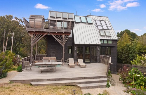 Eclectic 1970s 3 story home perched above Agate Beach in Bolinas is the perfect location for families or couples seeking a quiet, relaxing getaway in a rural location. With spectacular 180 degree ocean views , a sauna w/ an ocean view, and a well equipped kitchen, you won’t need to leave. Only steps away, down a rugged, narrow path, tide pools await. Beyond the two ocean-view bedrooms with Queen beds, and the bedroom with twins, there is also a room off the primary bedroom with a twin trundle. The full/queen pull out couch in the TV room can sleep up to two people. 2 full bathrooms, plus a half bath. 3 minute walk to Agate Beach, 7 minute drive to downtown Bolinas. 1/2 acre fenced garden has multiple decks with views, propane grill, large trampoline, and plenty of seating for a gathering. This is strictly a NO PARTY and NO PETS house. If local friends stop by during your stay and bring their dog, the dog must be kept outdoors, and cleaned up after. Bed Configuration: 2 Queens, 2 twins, 1 twin w/ twin trundle, pullout couch.