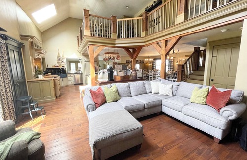 Located only minutes from downtown Sturbridge and the notorious Brimfield flea market, Abigail’s Nest is the perfect home for your vacation and holiday gatherings. One of a kind stunning handcrafted home featuring a modern open design. The warm country atmosphere, glowing ambience and wood-burning fireplace will create memories for a life time. Spectacular farmhouse feel with contemporary arrangement. Large kitchen is the center of the home. Enjoy traditional soapstone island, large custom cooking area with five burner top, butler pantry which stores double convection oven, microwave, toaster oven, coffee pots and ample workspace. Stay connected and together as you stroll from one space to another. Remember the tradition of gathering around the table at meal time? Well enjoy that once again with our large farmer table. The second floor is connected with a catwalk and loft. There are three bedrooms provided here. The chickadee room provides a queen size bed, 2 single beds, a single pullout, and a full bath. Our mockingbird room has a full bed, and the woodpecker room has a queen and one single bed. Each of these rooms shares a full bath with tub. Located on the first floor is a semi private room. This room doubles as a bedroom and gathering room. It consists of four single beds and a half bath just steps away. Plenty of space for air mattresses for additional guests. Rising to the sound of roosters, morning coffee on the sprawling front farmer porch and the picturesque view of grazing cows will be one of your favorite get away memories. Several large lawn areas for fun and games. The home sleep up to 15 guests. There are also four security cameras located on the property. One on each Farmer porch, play house, and pool area for your protection as well as the property.
