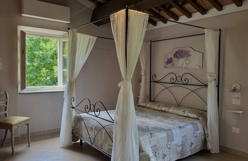 1 big double bedroom with 1 four-poster bed and 1 single bed plus 1 extractable bed, stunning views on the hamlet of Castelvecchio, 1 bathroom with shower, wc, bidet, basin, exit onto a terrace, from which you have access to the garden and to the swimming pool. The house is furnished with much care by the owners and painted in pastel colors; beamed ceilings. The house disposes of air-conditioning and WIFI. Washing machine.