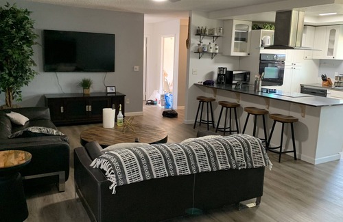 The Country Family Playhouse has all the essentials for your large group or family! A non-smoking1800sqft home with a large open concept living space where you can see the kitchen, dining area, and living room all in one area. Plus there's a bonus playroom with a foosball table, air hockey and more than 10 different board games. Each bedroom comes fully furnished with premium bedding, comfy mattress and bedframe, tower fan, night stand with USB charge and large closest. Two fully renovated bathrooms. Please message us directly to request for over 8 guest capacity.