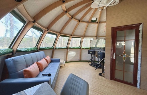 Luxury Domes: Enjoy spacious and comfortable domes equipped with modern amenities, including free high-speed fiber optic Wi-Fi, fully equipped bathrooms, and a 65-inch TV with 4K Netflix and Roku. Each dome features a king-size bed in the bedroom and a king-size sofa bed in the living room. Large windows provide beautiful views and natural light, while the interior combines rustic charm with modern comfort, creating a cozy and inviting space. Each dome is also equipped with HVAC, ensuring you stay comfortable in any season.