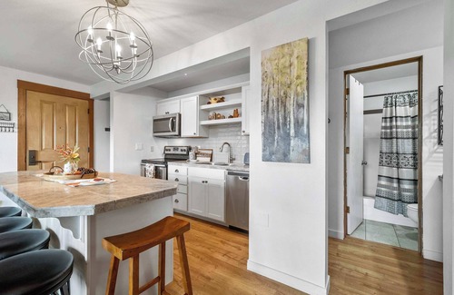 Let relaxation take you over as you lounge in the cozy living room on the plush sofa or armchair seating, setting the electric fireplace ablaze in the colder months to create the perfect ambiance for streaming a new movie on the mounted smart TV. The modern kitchen is fully equipped with stainless steel appliances, drip coffee maker, cookware, and dining ware for the added convenience of preparing delicious meals right from home. The spacious island also serves as the dining area, where high-top stools can seat 6 for formal meals and quick bites alike.