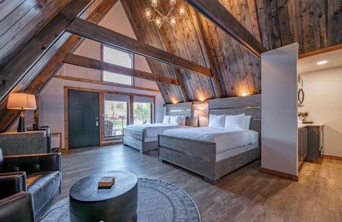 Unwind & Relax in this log cabin styled spacious vaulted peak ceiling room with two Queen beds and an electric fireplace for everyone to enjoy. Equipped with a luxurious bathroom with a walk-in shower and premium bath products, plus a convenient kitchenette and a Smart TV for your entertainment. Walk right out to the deck where you have two chairs to enjoy morning coffee and fresh mountain air.