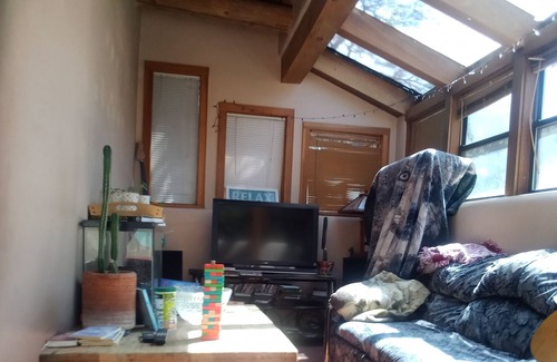 Right off Route 66. Sits in the Pines. There's a 10 pain skylight in the living room, so you can sit on the couch s at night and look up at the stars and moon. Pets are welcome. There's a nice fended back yard and romantic gazebo to sit outside under the stars. With a newly added outdoor theater system with Bose stereo. licensed massage therapist if you had a long hard day. you'll be greeted by female Great White Pyrenees, and Maine Coon Cat. Animal friendly and 420 friendly, look forward to..