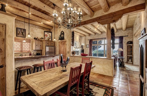 Cowboy Villa | Scenic View, Pool + Hot Tub Access is located in Tesuque. Cowboy Villa | Scenic View, Pool + Hot Tub Access provides accommodation, featuring Kitchen, Laundry, Accessibility, among other amenities. This House features Kitchen, Laundry, Accessibility, to make your stay a comfortable one.