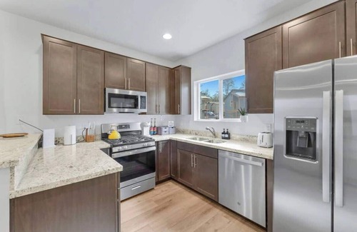 Step inside to a bright, thoughtfully designed space featuring an open-concept living area with a 55" smart TV, plush seating, and seamless flow into a fully equipped kitchen stocked with everything you need to cook and gather. With fast Wi-Fi, air conditioning, and a dedicated workspace, the home is just as suited for remote work as it is for relaxation.