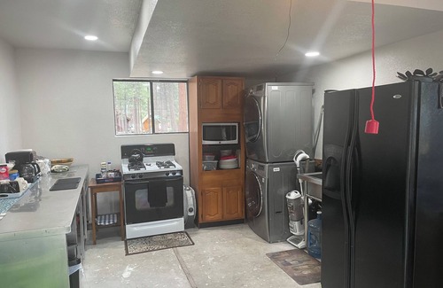 The cottage is within a 5 minute drive to the lake. It’s surrounded by pine trees and lots of neighborhood deer. There’s plenty of free parking available. The neighborhood itself is pretty quiet and mellow.