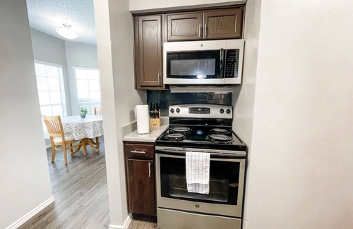 1 bedroom condo located on ground floor. 1 full bathroom. Living room with futon sofa (suitable for child or smaller guest - additional linens for the futon couch available upon request) and Smart TV. Kitchen with all appliances, basic cookware, utensils, and dishes. Dining room with table and 2 chairs. Private washer/dryer. Balcony with 2 chairs and small table. Private garage with room for one small to mid size vehicle. Additional free parking available on the premises.