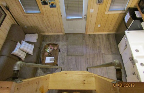 Inside, the kitchenette includes a microwave, sink and refrigerator/freezer. Downstairs, two bedrooms each offer a twin bed for a restful night's sleep. A full bathroom with a generous shower, sink and toilet separates the two bedrooms. We have the essentials covered: fresh linens, towels, shampoo, conditioner, body wash, bar soap and even pre-pasted toothbrushes are provided. Climb the sturdy, railed ladder to a cozy loft with two double beds and extra blankets. No matter where you are in the cabin, you can watch TV from any room!