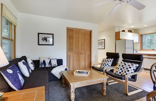 Cozy Cabin welcomes you with sunshine, a fully stocked kitchen, a wood-burning stove, a pullout sofa for additional guests, and more!