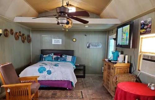 The cabin is located on our Lazy KO Ranch and situated with beautiful views of the Little Florida range. The cabin is an airy 400 sq. foot private space. It's warm and inviting with it's wood paneling and ceramic tile floor. There are lots of wall sconces and a beautiful copper light and fan fixture in the center area to provide soft, relaxing lighting. The cabin is decorated primarily in a Southwest style.