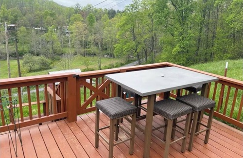 The cabin has 3 bedrooms and 2 full baths, a cozy family room with gas fireplace, dining, a fully equipped kitchen. A washer and dryer are also included onsite. Enjoy several of the outdoor sitting areas to take in all the views. The bunk room offers books and toys for kids to enjoy. Enjoy the gas grill for dinner while taking in the fresh air and stunning views. Take advantage of the large back deck overlooking the mountains and river or relax on the front porch while reading a book. Our fully equipped kitchen includes a selection of cookware, coffees a variety of teas and basic cooking essentials like sugar, flour, seasonings, etc. Relax by the outdoor firepit on a chilly night and enjoy the bonfire while being surrounded by the breathtaking charm of the mountain. As our guest, you will have access to free firewood located next to the firepit. On the property you will also find a chicken coop, to which you may have access to fresh, free-range eggs if they are available.