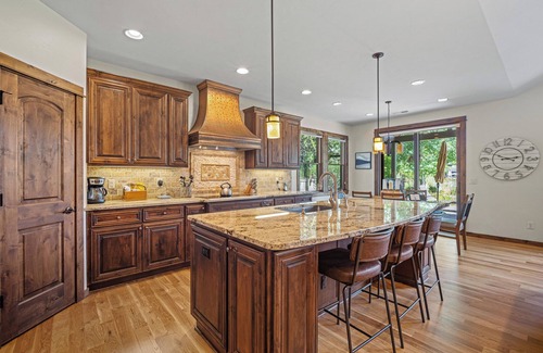 Inside this luxurious one-story cabin, you will find spacious kitchen, living and dining areas with large windows, hardwood floors, vaulted ceilings and wood beam accents. Additional features of this beautiful home include: